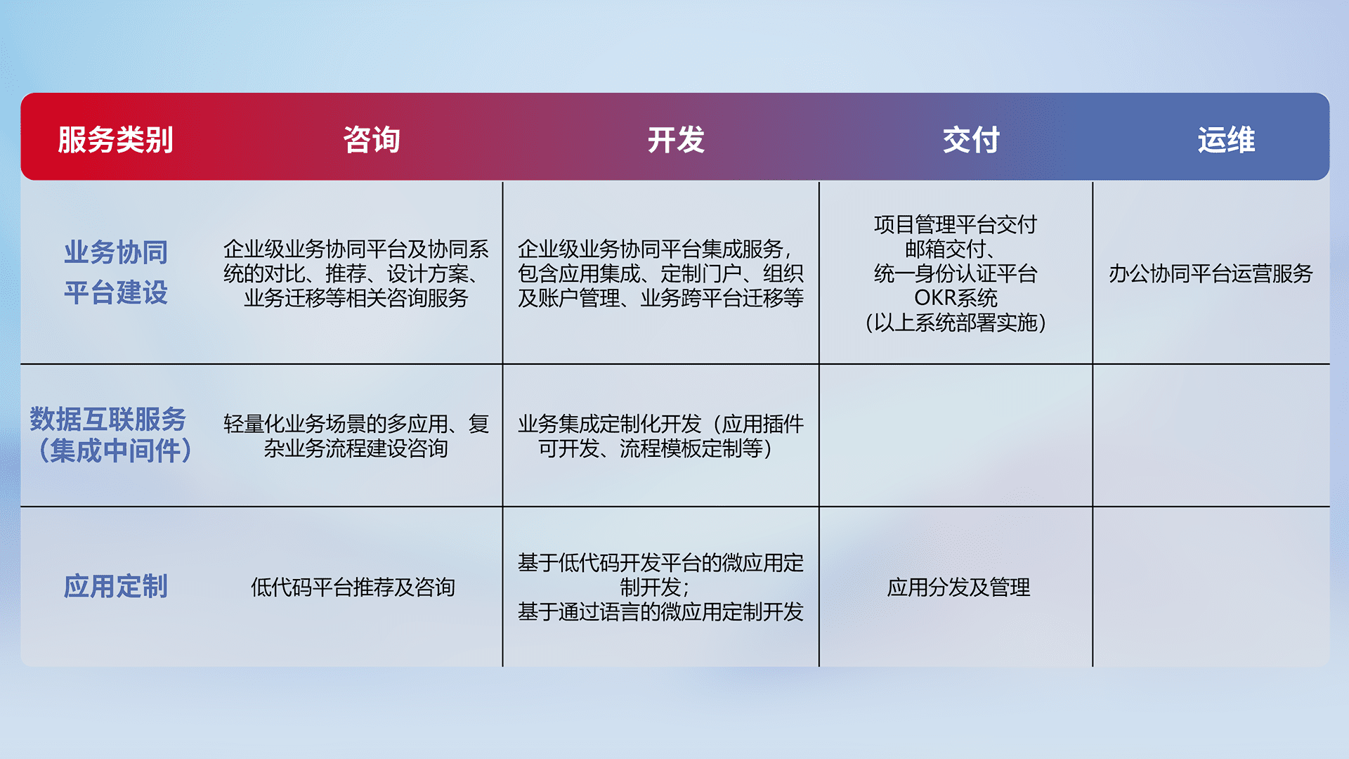 针对钉钉、、、企微、、、IDaas等平台级产品提供产品的规划、、方案、、交付、、、、定制化开发等服务,,,,实现如统一协同办公、、、、智能客户服务、、、、混合会议管理、、智能数据查询、、、、等业务场景,,,,实现数字化转型。。。。